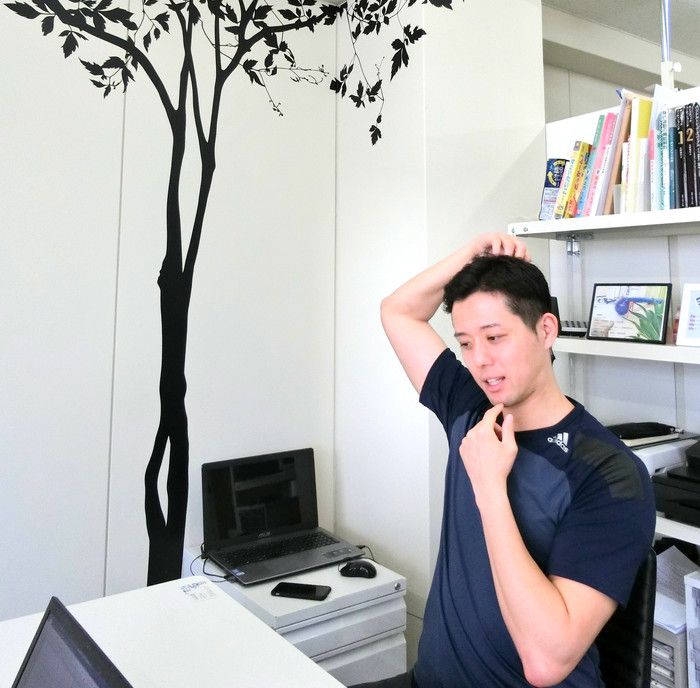 顎を引き、頭の位置を少し後ろに重点を置いて、座ることで自然に腹筋が鍛えられます。