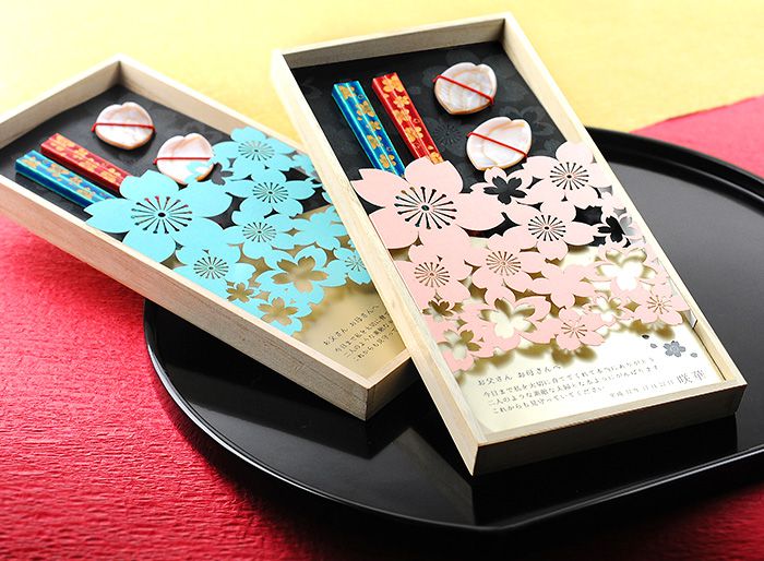こちらは美しい桜のデザイン!お箸も箸置きも桜のモチーフです♡ピンクとブルーの2色からお選びいただけるので新郎・新婦さまご両家に色違いで贈られる方が多いです。