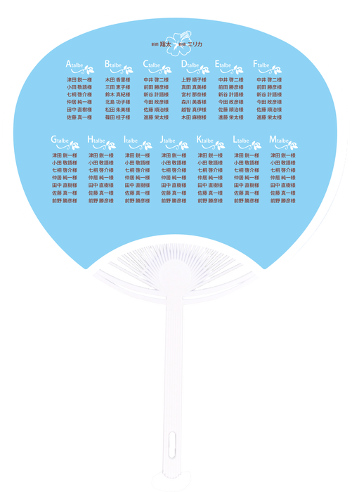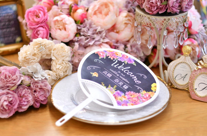 その名の通りゲスト一人一人の名前をうちわに印刷して席に置き、席札としてご使用いただきます。当日テーブルいっぱいに並んだうちわはかなりのインパクト♡