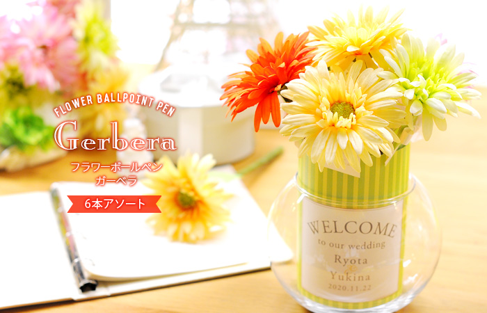 記帳用のペンもこだわって受付をもっと華やかに!まるでお花みたいなペンにゲストも気分が高まります♡ガラスのベース部分にはWelcomeの文字とお名前&挙式日入りでウェルカムアイテムとしても使えるスグレモノです。