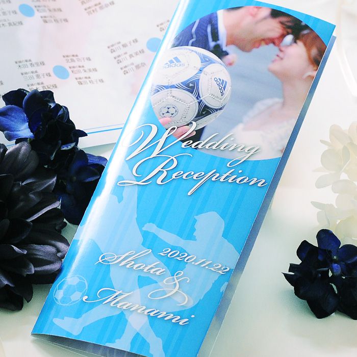 こちらはサッカー好きのおふたりのためのデザインです。サッカーのアイテムやポーズのお写真を使っておふたりらしい席次表を作りませんか?