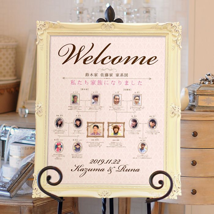 家族を大事に思うおふたりのココロが伝わるウェルカムボード。おふたり+家族のお写真と紹介文でゲストをお出迎えしましょう。式後は新居に飾れば、いつも家族の絆を感じられます♡