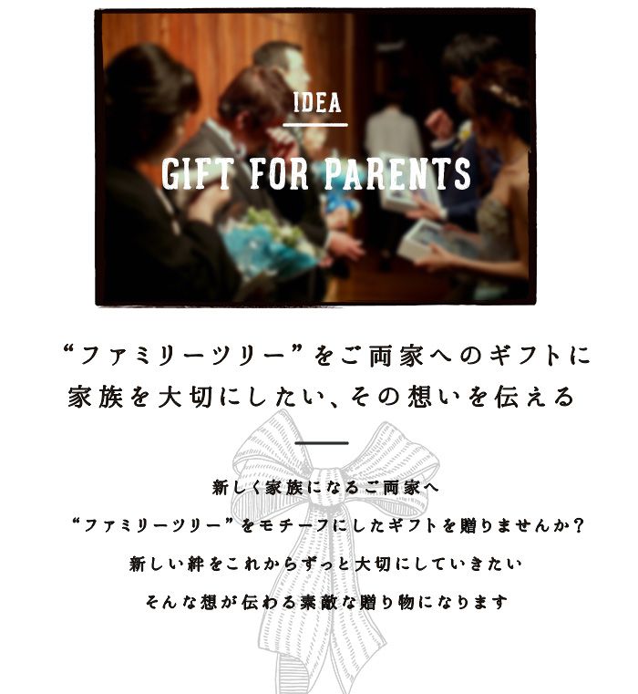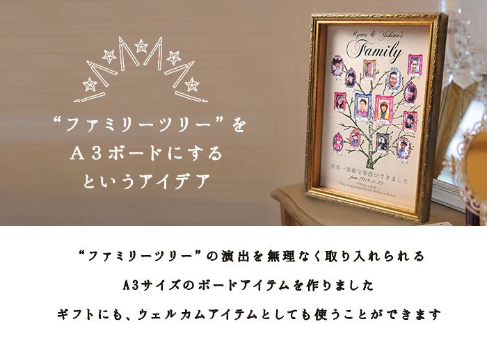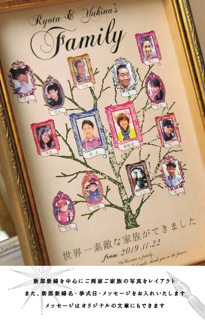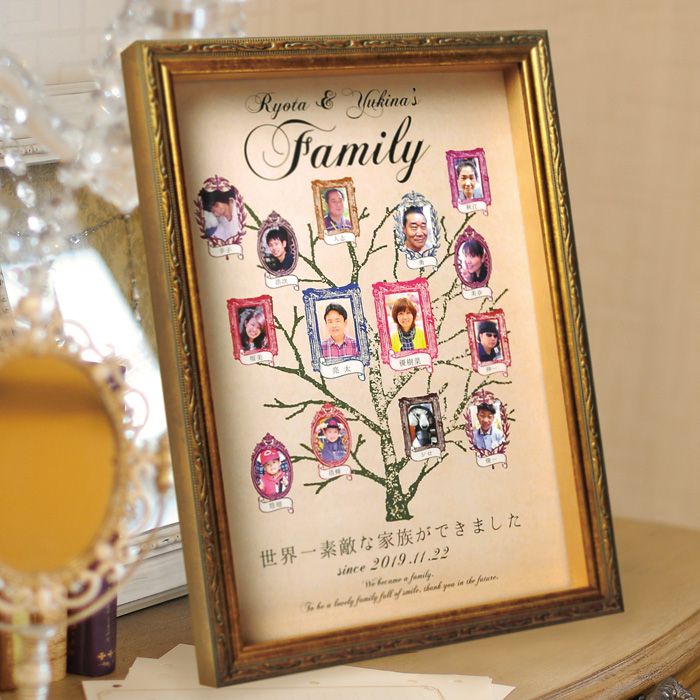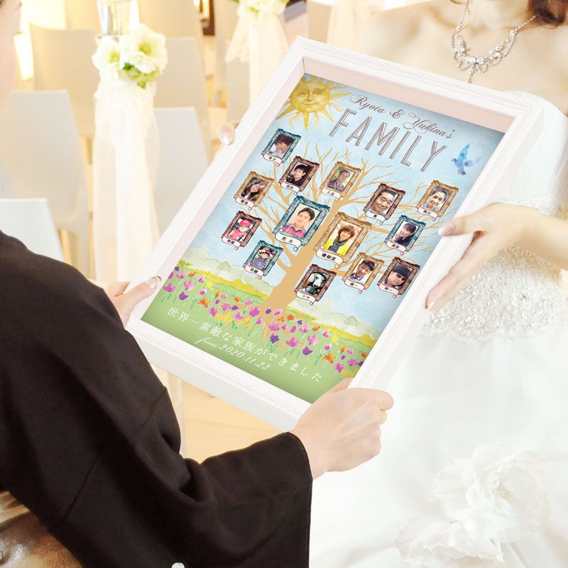 ファミリーツリーを、ご両親へのプレゼントにしたのがこのアイテム。家族の写真と名前が入ったファミリーツリーは、ご両親への感謝の気持ちと、新しい家庭を大切に築いていく決意を伝えられる最高の贈り物です♡