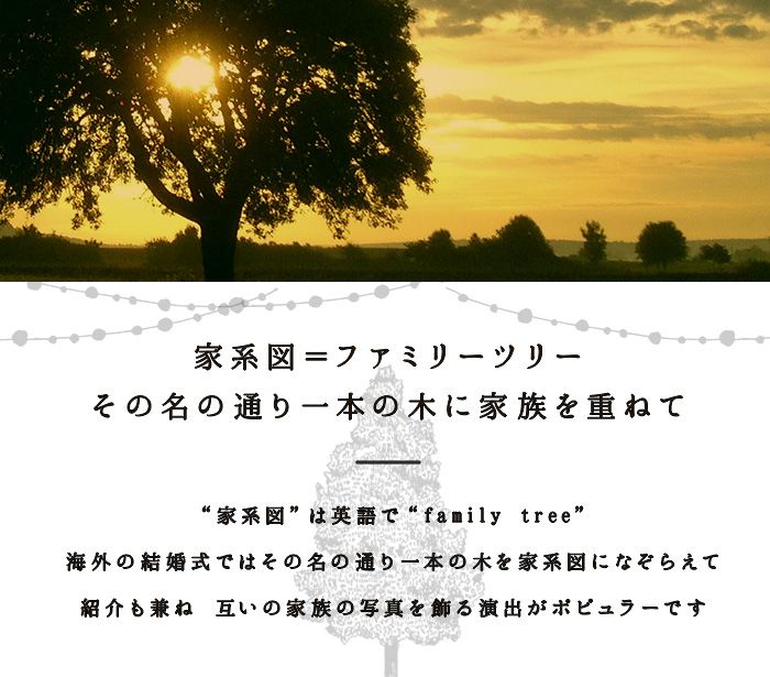 「家系図」は英語で「family tree」。海外の結婚式ではご家族のお写真を一本の木に飾るファミリーツリーの演出が人気です。最近では日本でもウェルカムスペースにファミリーツリーを飾るカップルが増えています。
