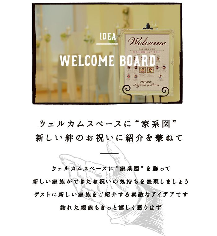 家系図をウェルカムボードにしませんか?それぞれの両親から生まれ、つながり、家族になる。そんな「縁」と「絆」を結婚式でゲストに披露しましょう。親族紹介はあるけどゲストにはなかなか家族を紹介する機会ってないですよね。家族の自己紹介コメントを読めばぐっと親しみも感じ、披露宴でも盛り上がること間違いなし!感動ウェディングを叶えるアイテムです♡