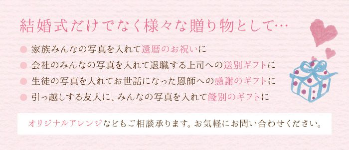 結婚式以外でもご両親の金婚式のお祝いや、おふたりにベビー誕生時の記念の品として…などなどアイディア次第でいろいろな使い方ができます♡