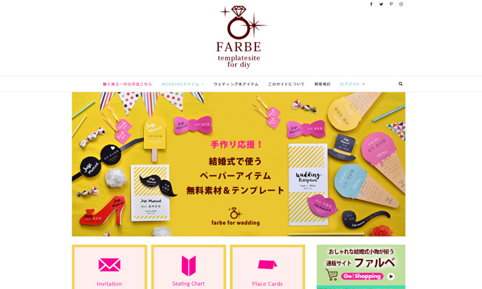 もうひとつは会員登録&SNSで拡散していただくことをおねがいしている無料のファルベテンプレートサイトです。こちらは招待状や席次表といったベーシックな素材から、子育て感謝状やフォトプロップスといった今話題のアイテムまで約800種類の素材がDLできちゃうお役立ちサイトなんです♪