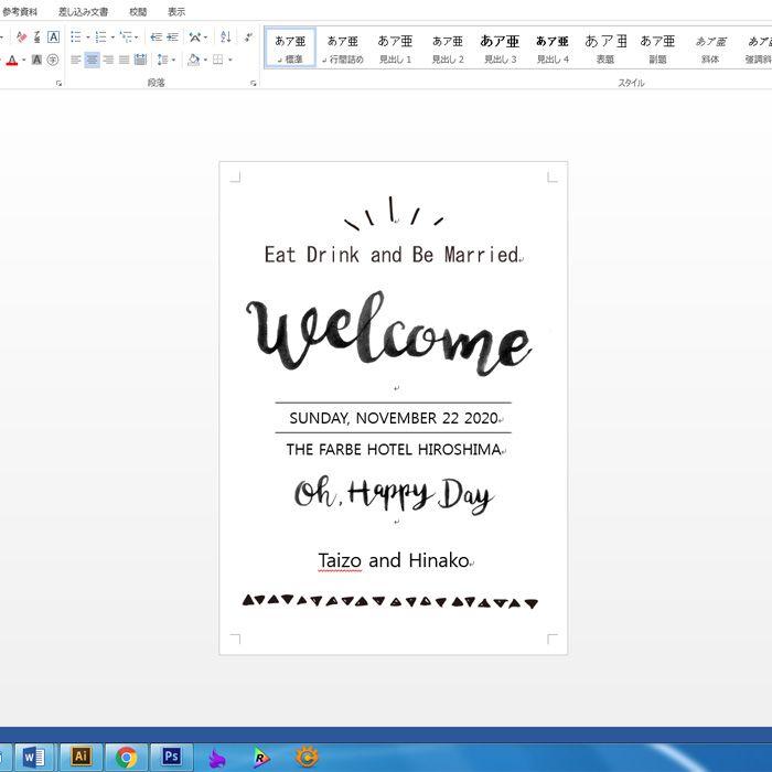 文字を横に並べたり、大きくしたりちょっとデザインするだけでオシャレに仕上がるのでプロのデザイナーじゃなくてもカンタンに、オシャレにアイテムが仕上がります。ウェディングアイテムのテンプレート無料素材を使えばさらに簡単にできるから、ぜひ利用して。