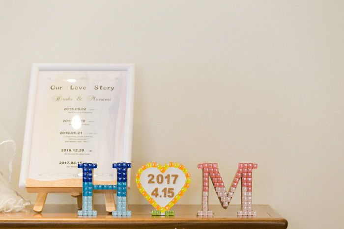 その他ウェルカムブースに飾られている、イニシャルオブジェは海をイメージして、ガラスタイルを使ってDIYされたとのこと。