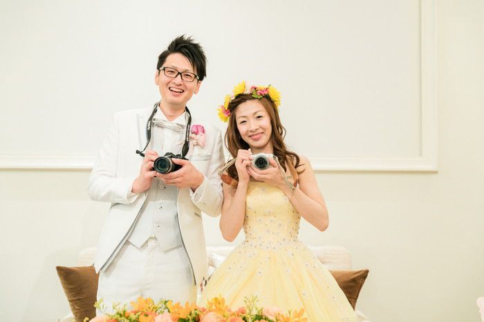 イエローの衣装がとってもお似合いの新婦さん。サプライズあり、涙あり、感激尽くしの結婚式はお二人らしさがでた、最高の一日だったことと思います。カメラが趣味のお二人。タキシード&ドレス姿でカメラを持った写真はお二人らしい最高のショットであり、最高の思い出に♡