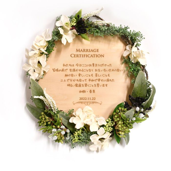 とくに二人の誓いを彫刻する結婚証明書ならその後も約束事をいつも目にする場所に飾っておけ、二人にとって大切な結婚式の記念品になります。自分ギフトとして使っていただけるスグレモノ♡