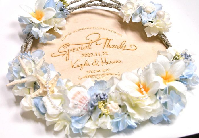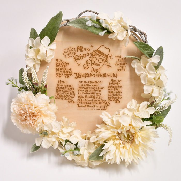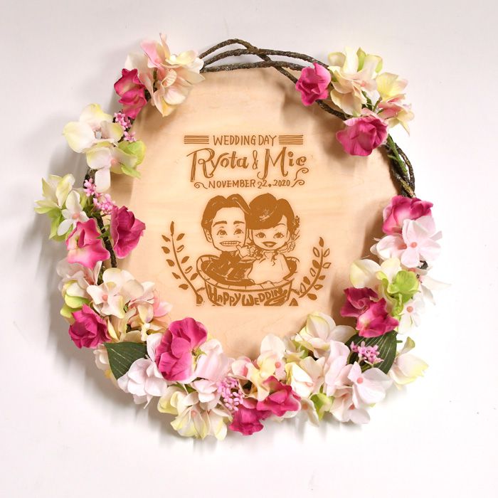 木のプレートにレーザー彫刻してお花をアレンジメントして仕上げる花嫁の手紙はアイデア次第で色々な用途として使えるんです。