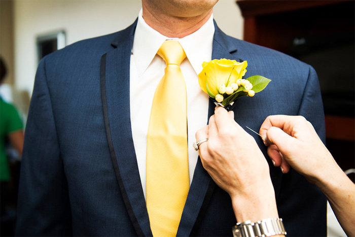 花嫁たるもの、やっぱり純白のドレスが着たい!というならば、新郎の衣装をテーマカラーのネイビーに。男性のタキシードやスーツなら、ネイビーカラーのデザインも豊富で選びやすいのでおすすめです。さらに個性をアピールしたいときは、蝶ネクタイやブートニアで明るめの色をポイントカラーに加えると、よりおしゃれ度がアップ!
