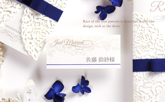 招待状などのペーパーアイテムも、もちろん抜かりなくテーマカラーに合わせたネイビーを選んで。クロスやランナーがベーシックな白の場合は、席次表や席札などのペーパーアイテムをネイビーにするだけでも会場全体のポイントカラーに効果的です。