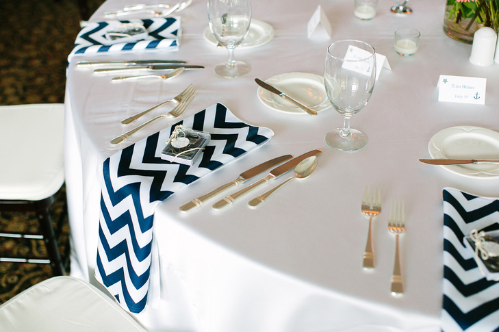 会場のテーブルコーディネートではクロスやテーブルランナー、ナプキンなど、どこか1か所にネイビーを取り入れてみて。このとき、あまりネイビーの分量が多すぎてしまうと会場全体が暗い印象になってしまうので、バランスを見ながらカラー配分を決めていきましょう。