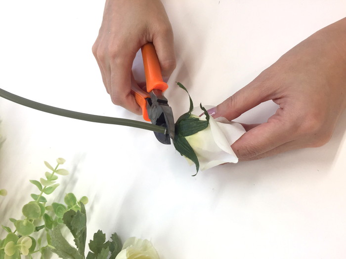 花束やアレンジして使えるように茎付で販売されているのがほとんどなので、ウェルカムボードや感謝状で使用するときは、まず茎をカットしていきます。