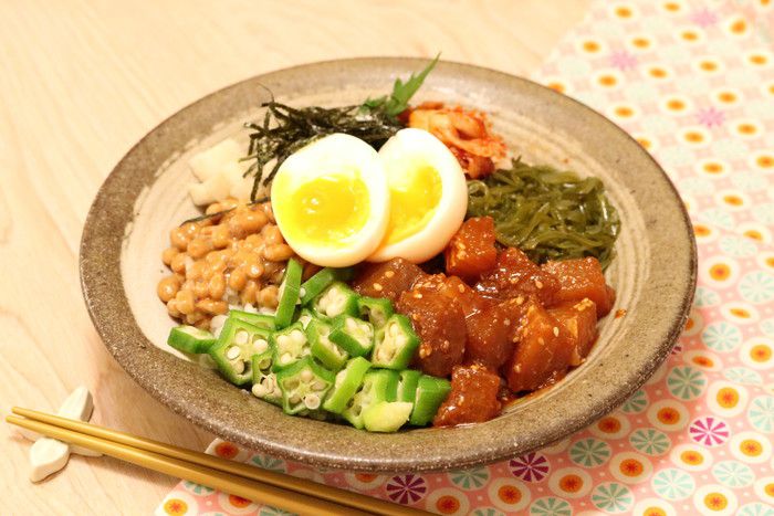 マグロ(さく)150g、納豆1パック、メカブ2パック、ヤマイモ60g、オクラ4本、キムチ60g、半熟卵 2個、シソ2枚、きざみのり各適量、ご飯適量
