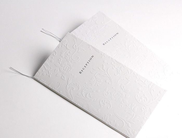 美しいパール感のあるペーパーにボタニカル柄がエンボス加工された純白の席次表。会場の光をあびると陰影がさらにまた美しい!RECEPTIONの文字はシルバーの箔押し。どんなシーンにもマッチする上質感です。