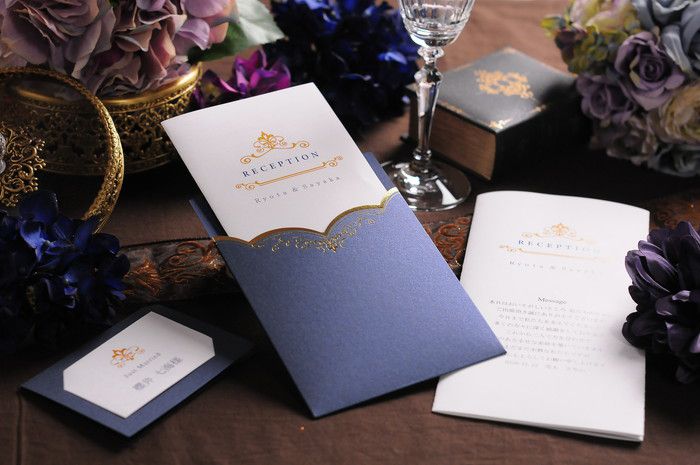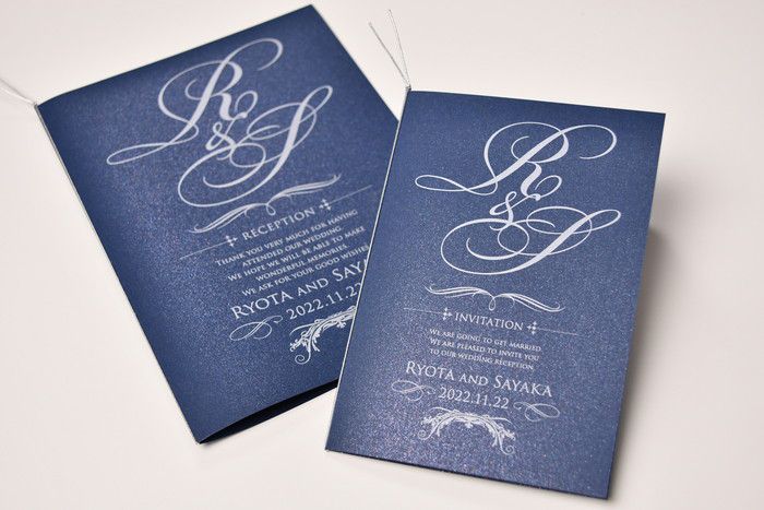 深いブルーの表紙はキラキラ繊細なラメ入りで上品な輝き。大きくレイアウトされているのはふたりのイニシャル。ホワイトの文字がスタイリッシュに映えて海外風のおしゃれなペーパーアイテムです。