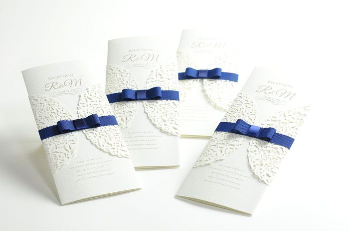 レースとリボンに包まれたラグジュアリーな席次表。ネイビーのリボンがアクセントになって、甘くなりすぎない清楚さを感じさせてくれます。繊細な質感のレースは実はバラの模様。花嫁のドレスを思わせるデザインにゲストもうっとりすること間違いなし。