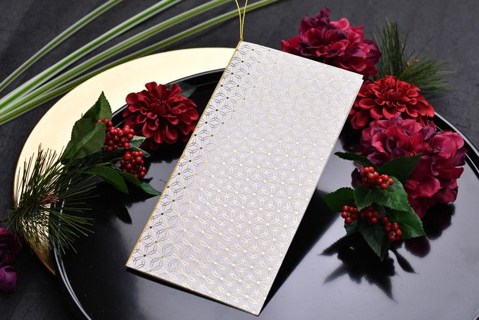 和柄のデザインを主役に、あえてよけいなものを加えずにデザイン。和柄は伝統的な輪つなぎ模様のパターン。金色に輝く箔押しを一面にちりばめて、おめでたい席にぴったりの大人の和モダンにしあがっています。