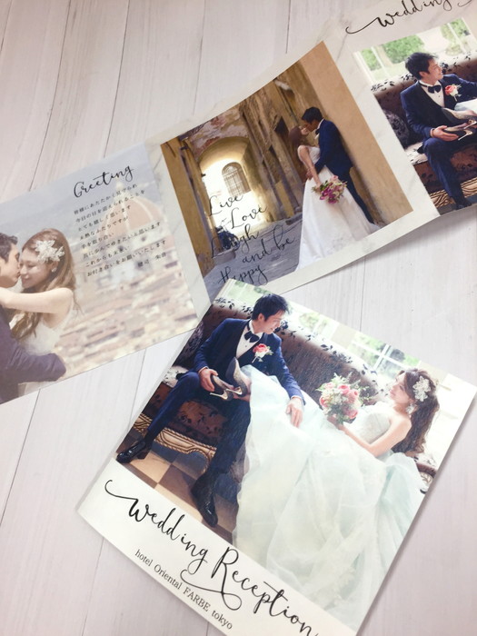 例えば席次表と一体型タイプなら式場さんでオーダーできる場合も多いです。ただフォームが決まっていたり、写真点数も決まっていたりするので、流行のフォトジェニックなペーパーアイテムに仕上げたいなら自分で作るか、専門業者に依頼するのをおススメします。