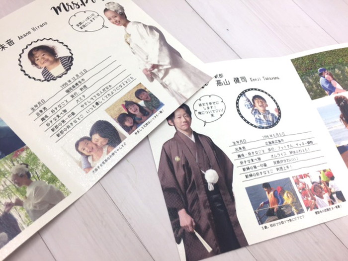 新郎・新婦それぞれのプロフィールページ。写真も今の写真と幼少時といれましょう。内容は名前:生年月日:出身地:趣味:好きな食べ物:新婦の第一印象:新婦のすきなとこなど。