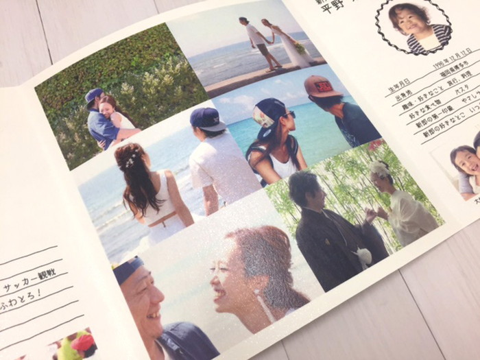 プロフィールブックだけ作る良さは写真点数をたくさん載せられるところ。幼少時や学生時代のお写真やせっかくとった前撮りの写真をふんだんに使えばオシャレで見応えも読みごたえもある1冊になるはず。