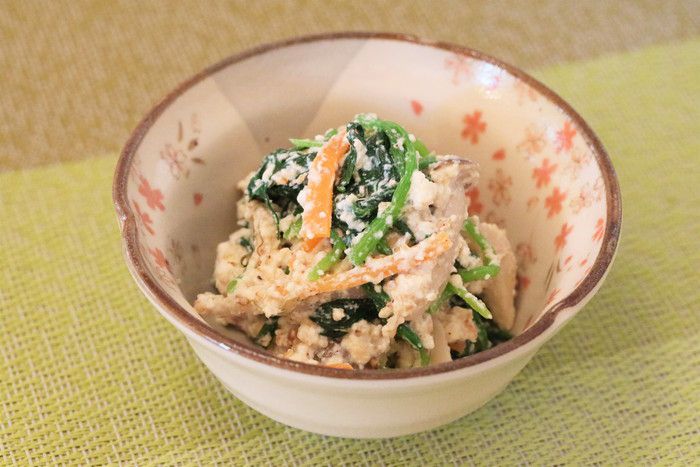 絹ごし豆腐1丁(300g)、ほうれん草 1袋(200g)、人参1/4本、シメジ1/2袋、白炒りごま30g、薄口しょうゆ小さじ1【A】みそ40㌘、きび砂糖大さじ1、塩少々