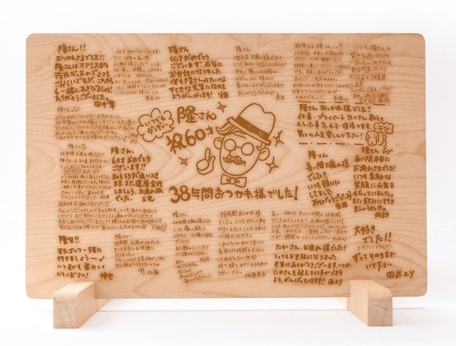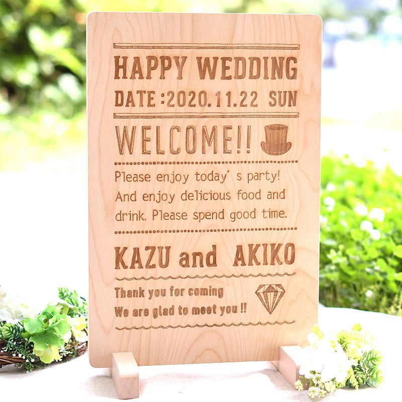 などなど。デザインデータ、メッセージを書いて持ち込めば、ウエルカムボードに刻印できます。