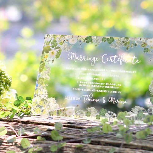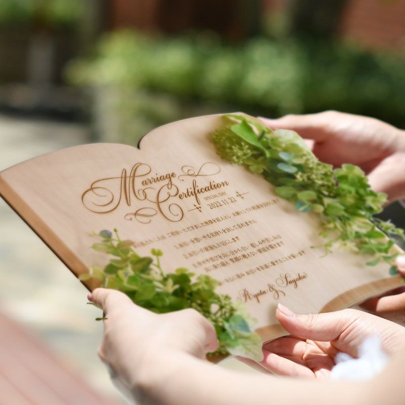 ナチュラルな質感のウッドボードにレーザー彫刻をほどこした結婚証明書。お二人のお名前と挙式日、誓いの言葉を刻みます。誓いの言葉はお二人だけのオリジナル文でも追加料金なしで作成可能です!