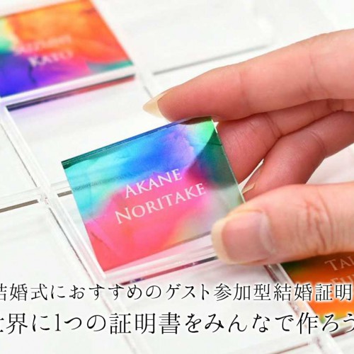 形式や流れに左右されない結婚式の人前式の場合、承認アイテムが注目されます。特にゲストのみんなと一緒に作る“ゲスト参加型の結婚証明書” はおしゃれで個性…